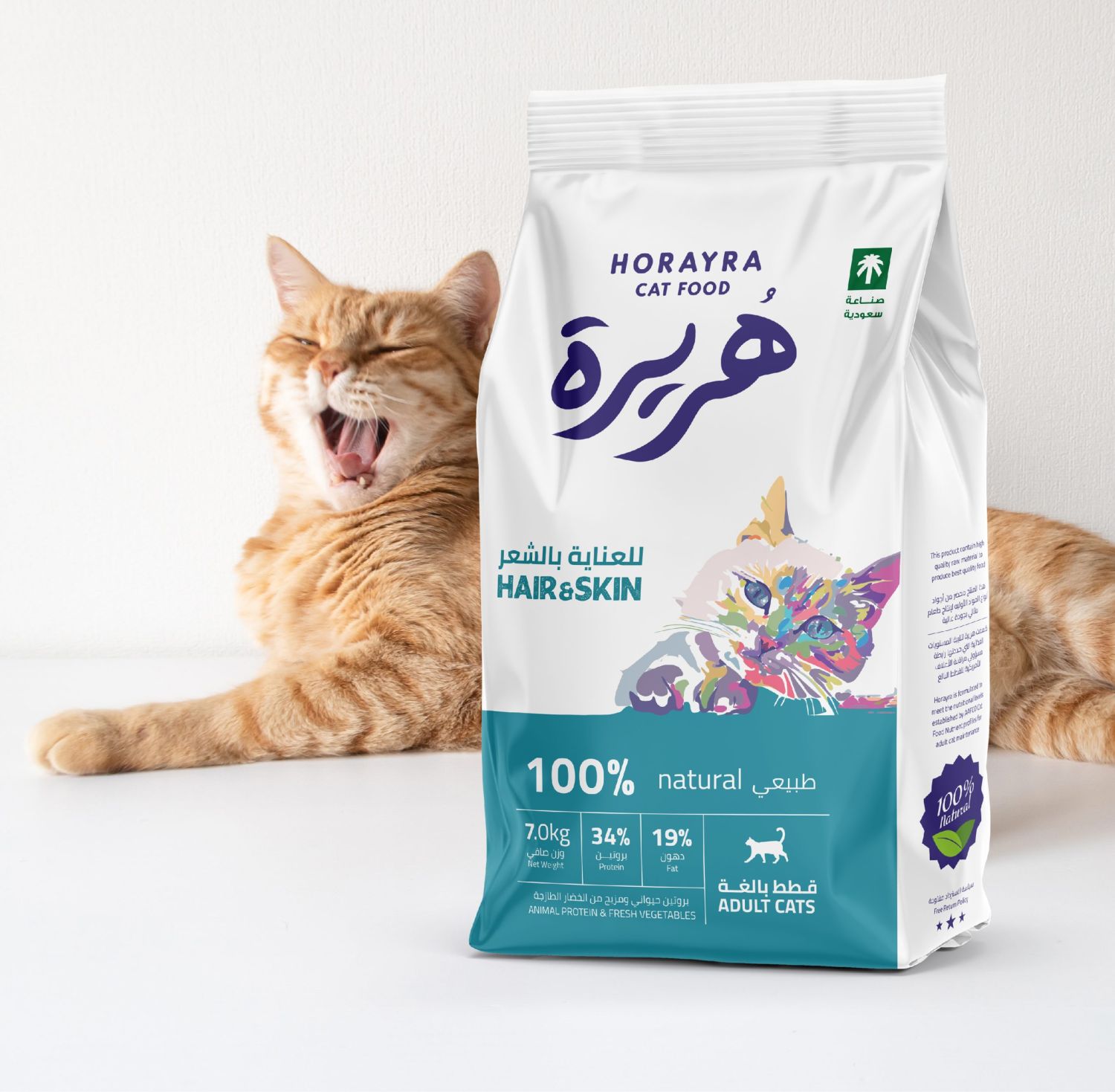 The challenge was to create a new packaging design for Horayra’s new functional line. They wanted to create something that emphasized their identity, making it instantly recognizable. The packaging had to feature the brand’s logo and colors, include their mascot cat, and highlight their pride in being a 100% Saudi brand. As the brand was still in the market penetration phase, establishing strong brand recognition was critical. Additionally, the packaging layout needed to be consistent across the line to differentiate it from their nutritional line.